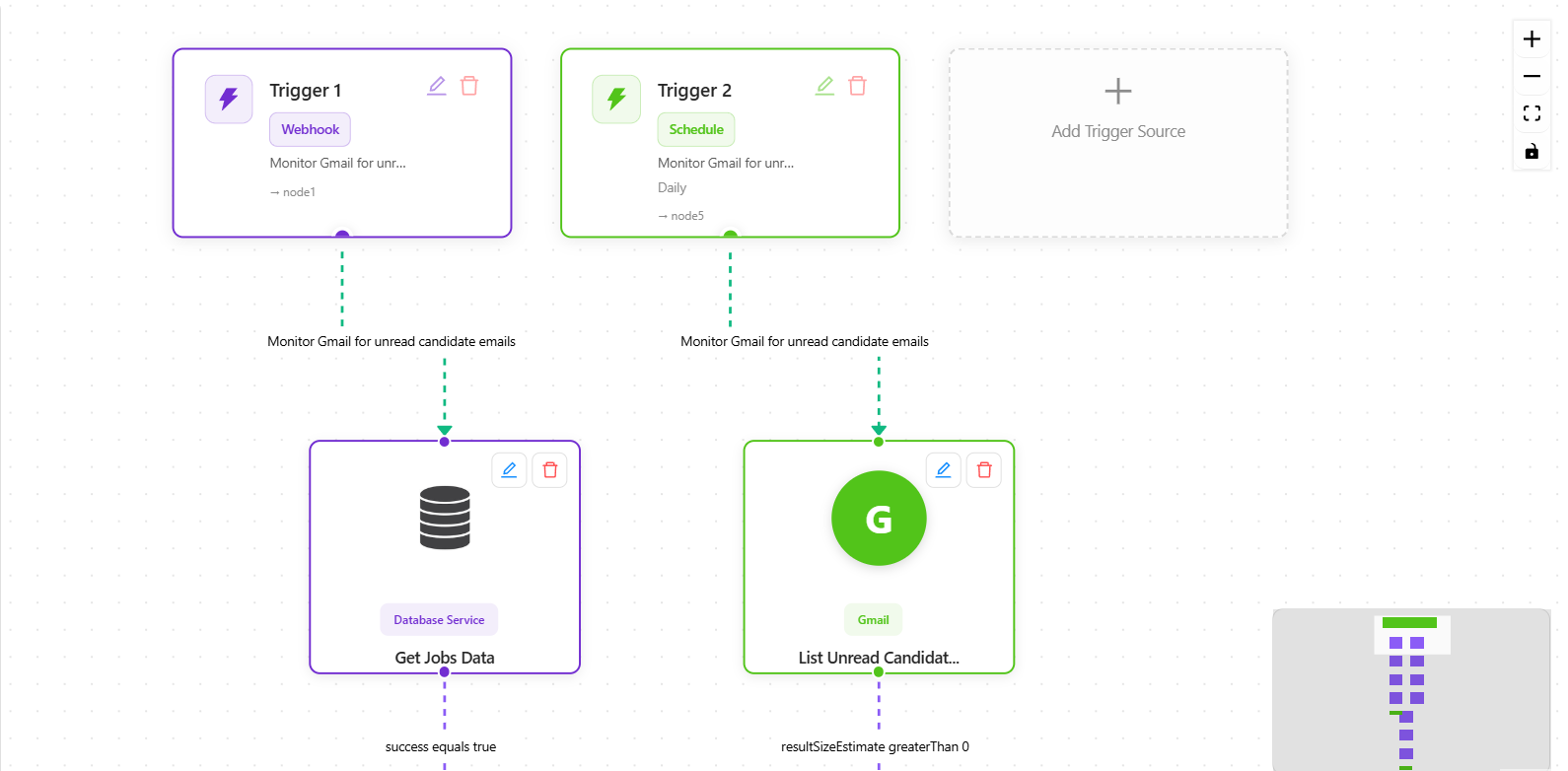 Multi-round interview flow with schedule triggers and Gmail handling.