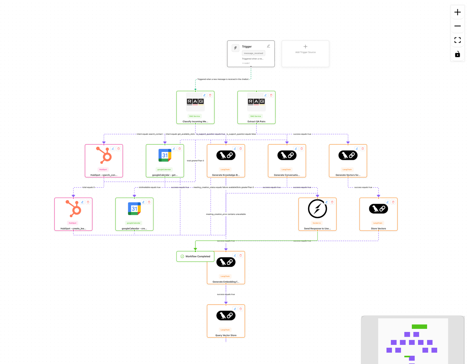 Customer support flow with ticket creation + status checking via HubSpot.